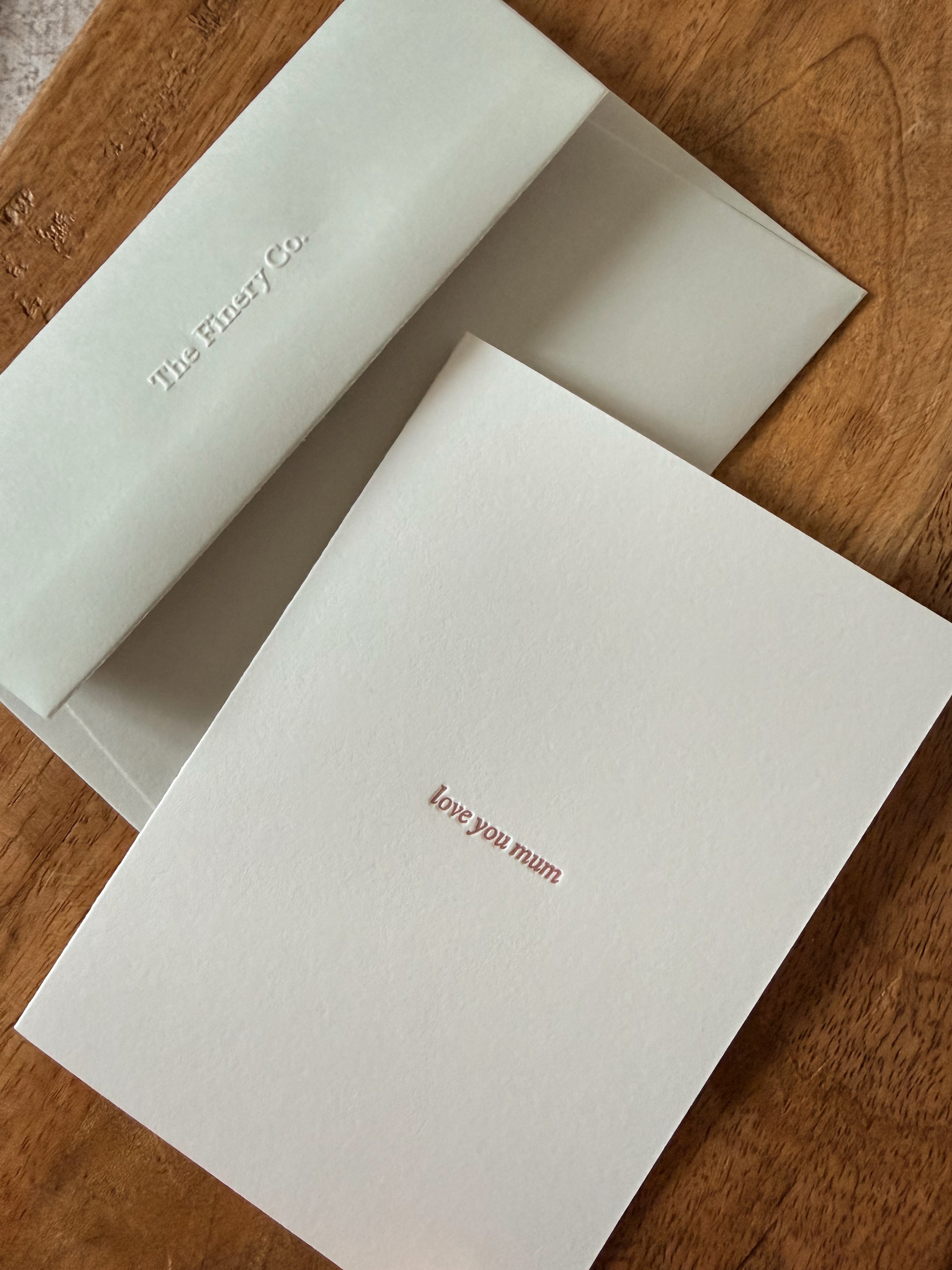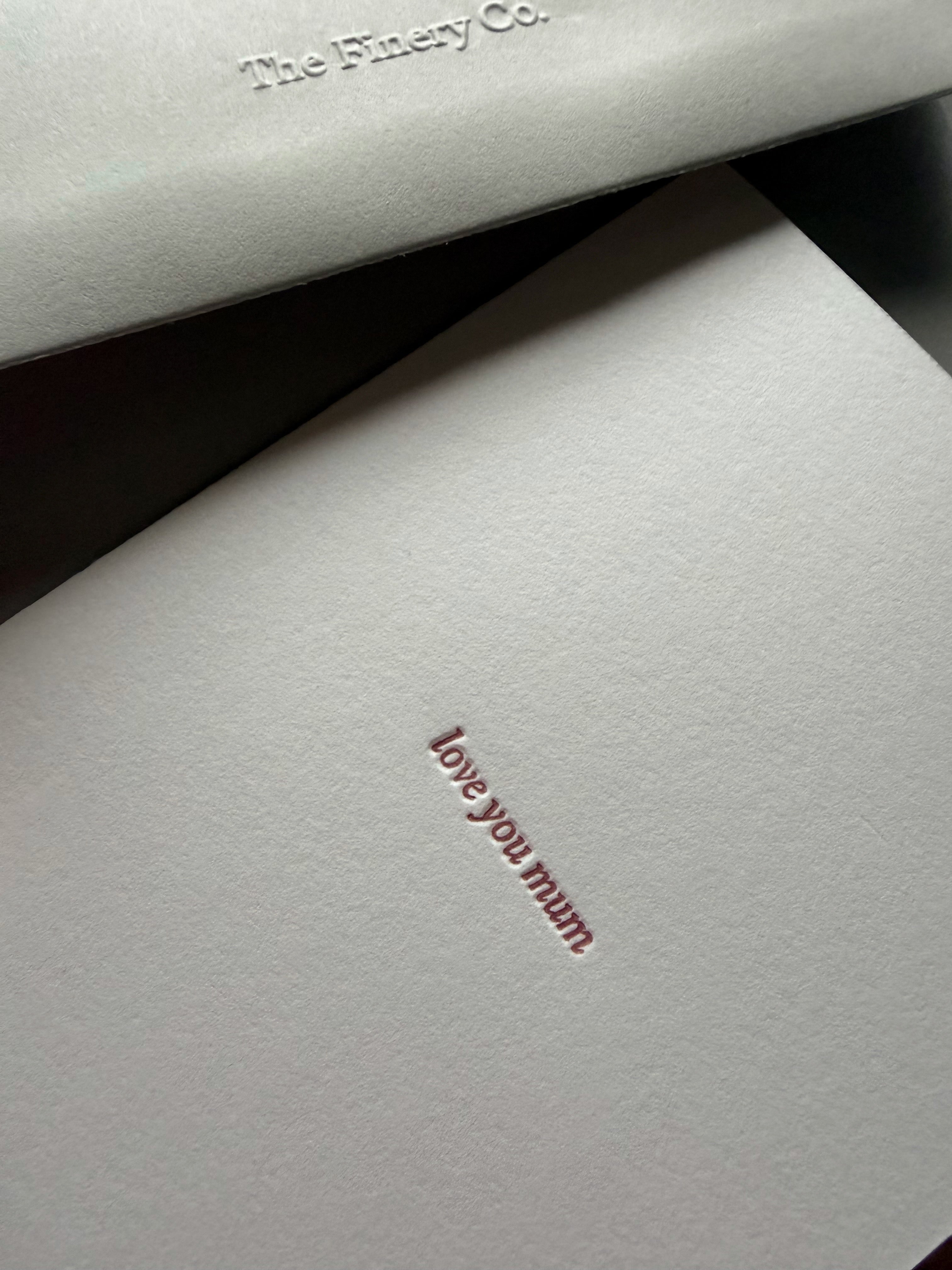 Featuring the words “love you mum” in a soft, dusky pink ink, this design is intentionally minimal. No embellishment. No excess. Just a quiet, heartfelt message that says exactly what matters.