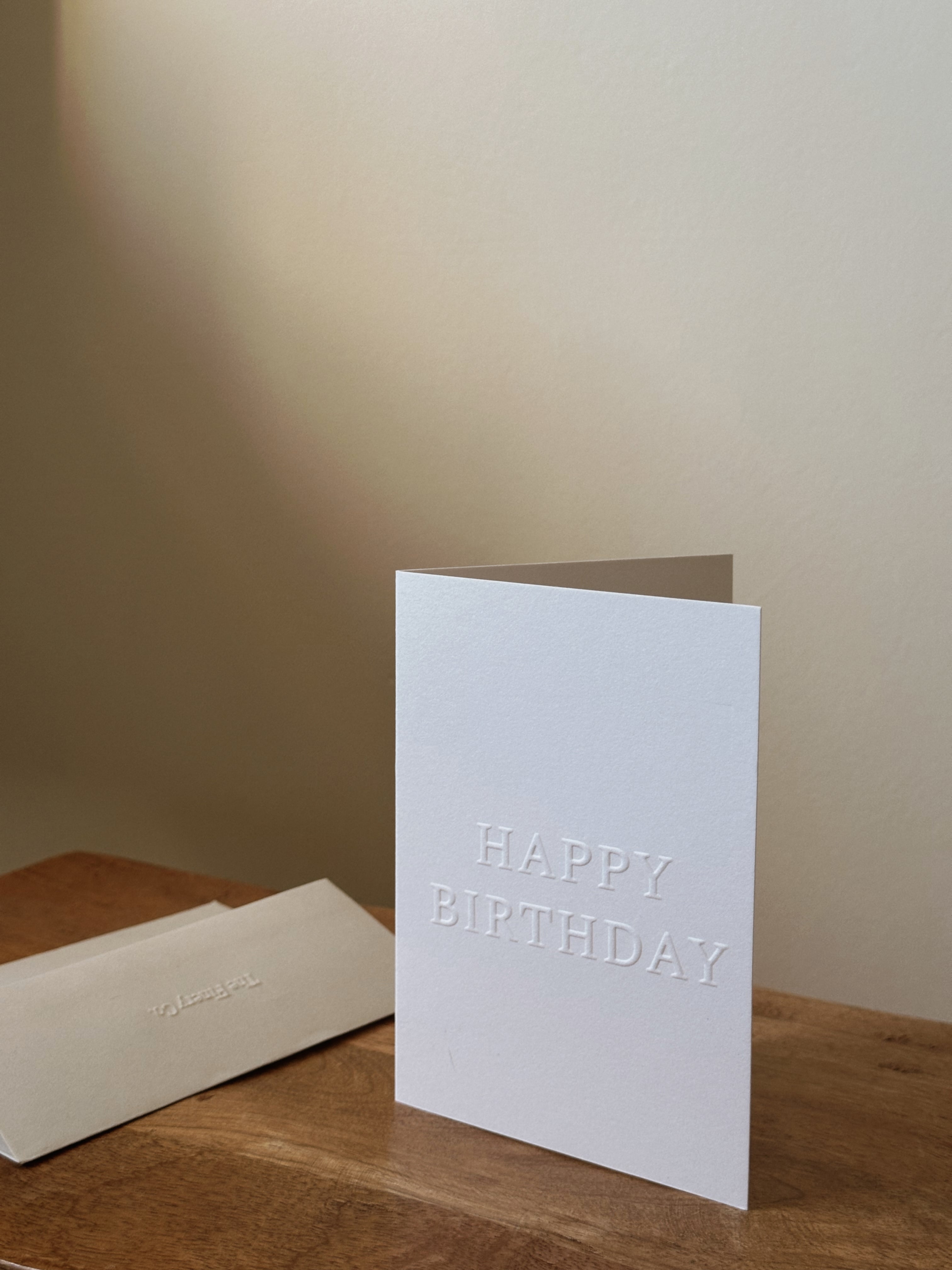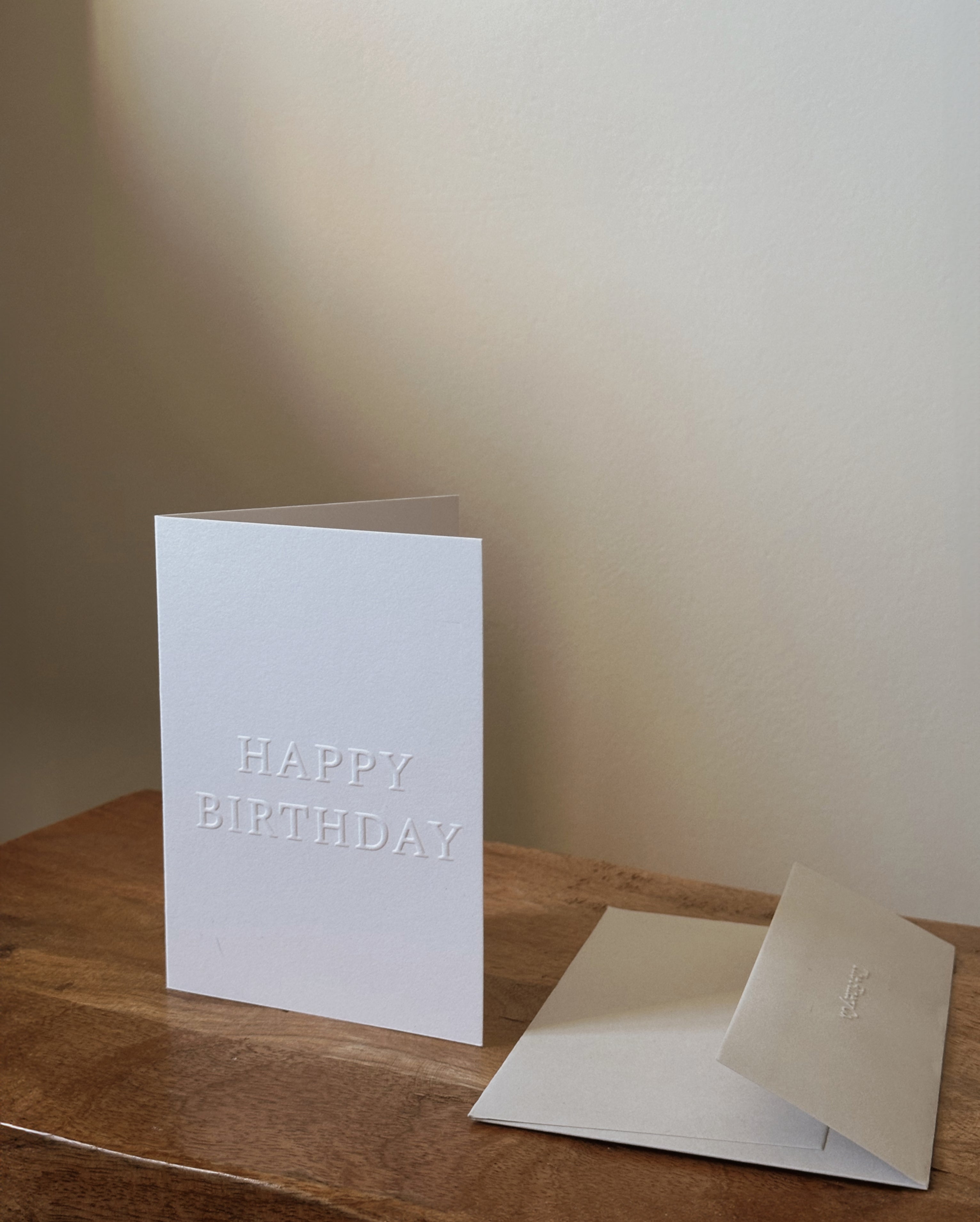 A beautifully simple letterpress birthday card, featuring a classic Happy Birthday design blind-embossed onto softly textured 100% cotton paper. Elegant, timeless, and understated - perfect for marking any special day.