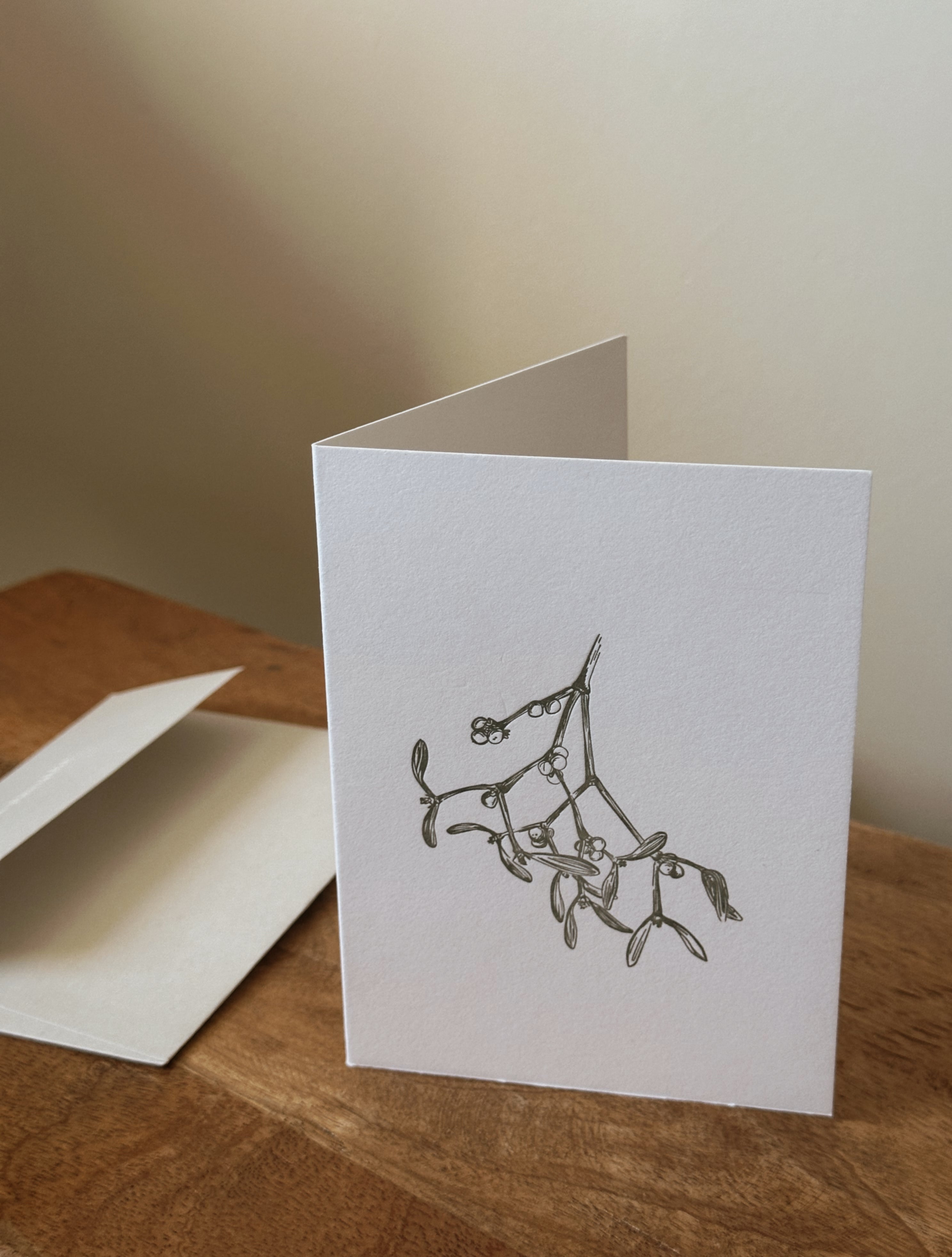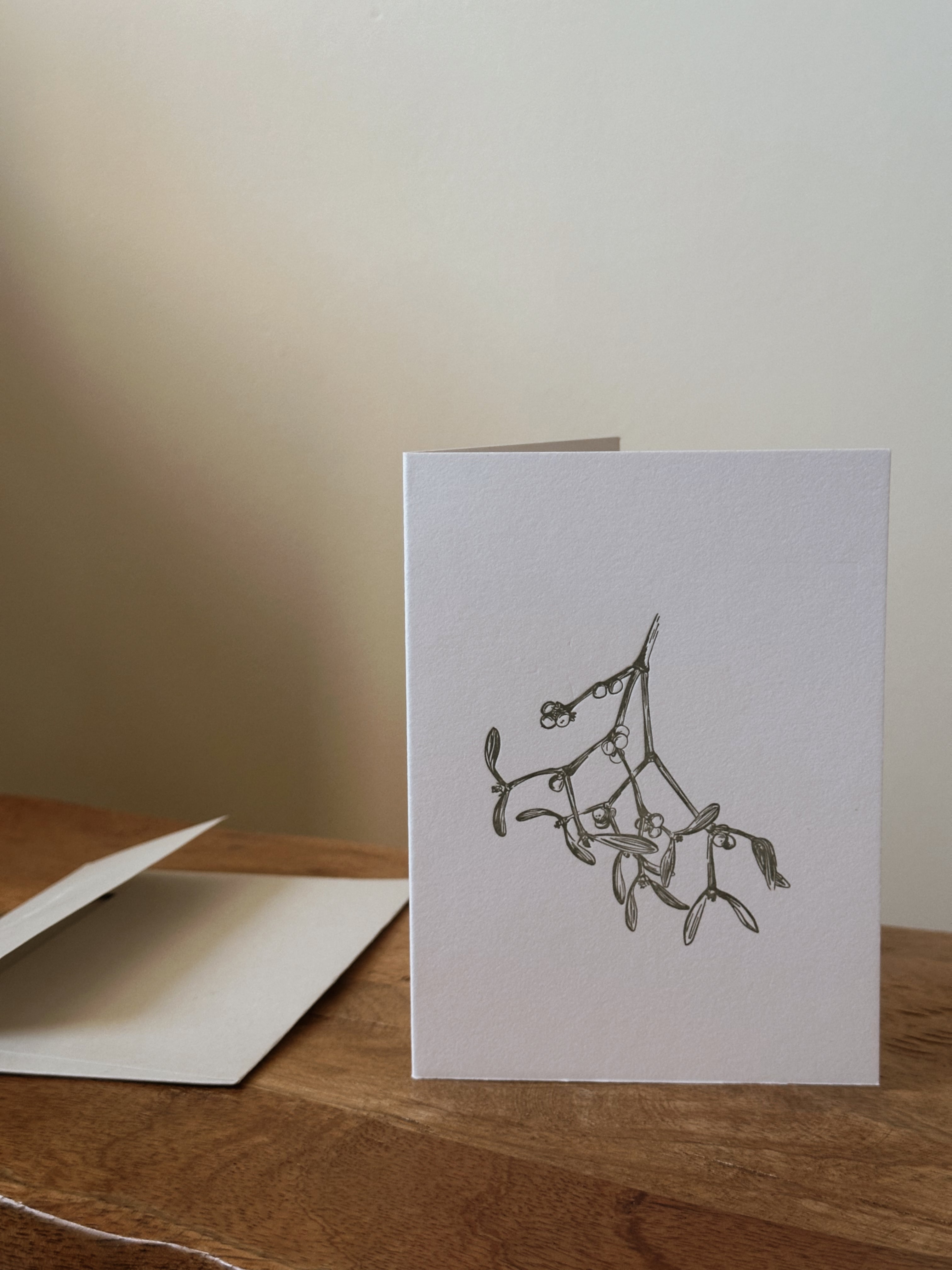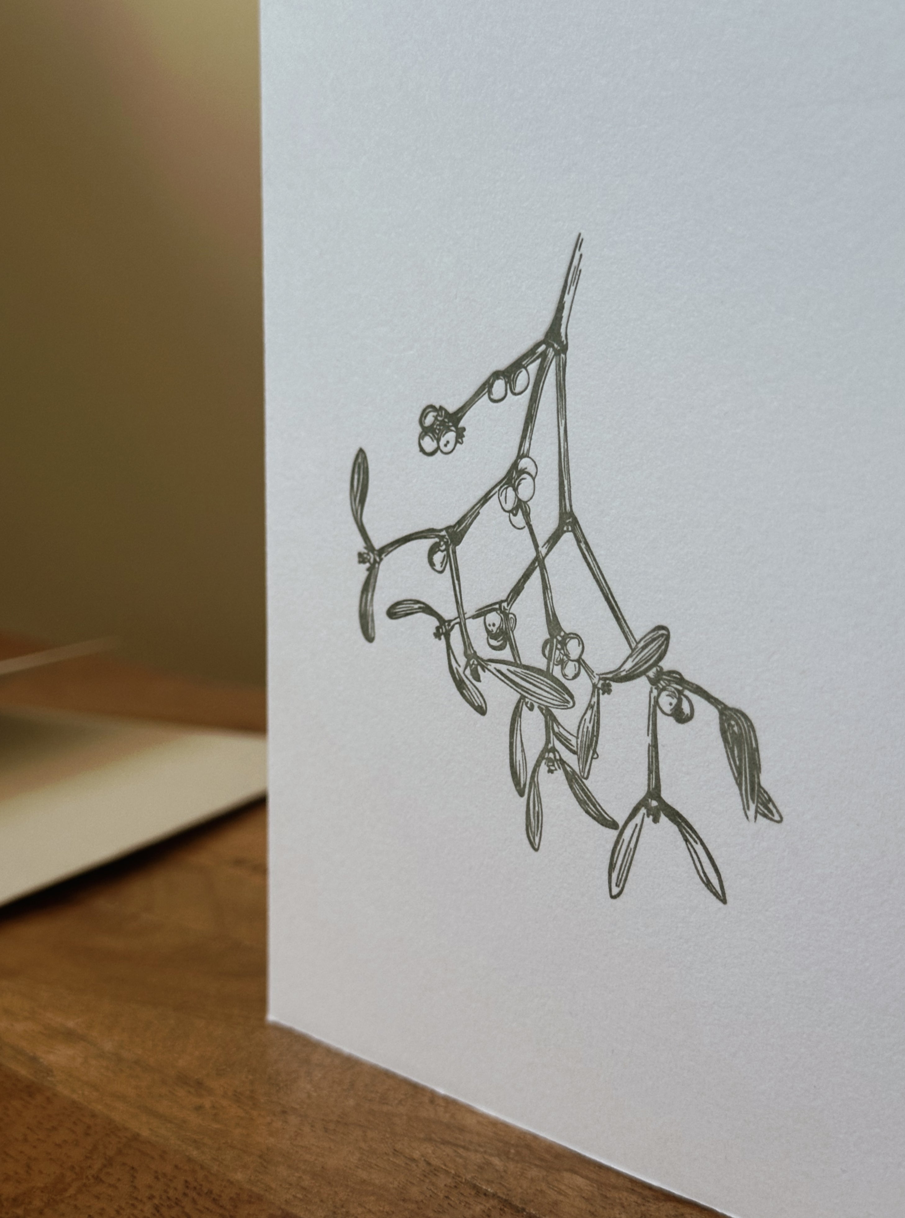 A minimalist yet meaningful Christmas card. This elegant mistletoe design, printed in a timeless earthy dark green ink, is the perfect way to wish loved ones a joyful festive season. Printed on 100% cotton card.